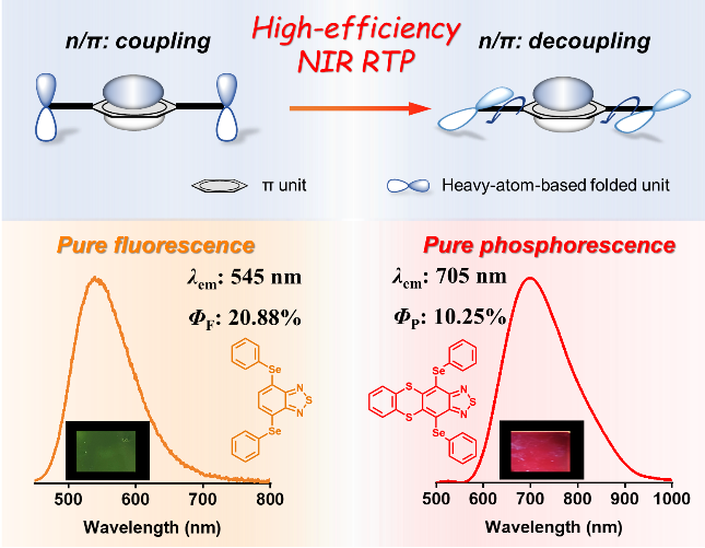 纯有机室温磷光(RTP)材料在有机发光二极管(OLEDs)、信息安全、生物成像、氧气传感等领域具有广泛的应用价值。近年来,从抑制非辐射衰减和促进自旋轨道耦合(SOC)增强两方面入手,科研人员已经提出了多种策略以制备高效率的纯有机RTP材料。但是大多数纯有机RTP材料的光色主要集中在黄绿光区域,限制了它们在红光/近红外(NIR)发光领域的应用前景。实际上,制备高效率的纯有机NIR RTP材料主要面临以下三个难题:(1)能实现NIR RTP发射的纯有机小分子数量极少;(2)纯有机分子的SOC系数很弱,难以构建有效的系间窜越(ISC)通道,降低了三重态激子产率;(3)受能隙规则的限制,当磷光发射在红光/NIR区域时,加剧的非辐射跃迁途径会显著猝灭磷光。因此,如何制备高效率的纯有机红光/NIRRTP材料是一个亟需解决的科研难题。
