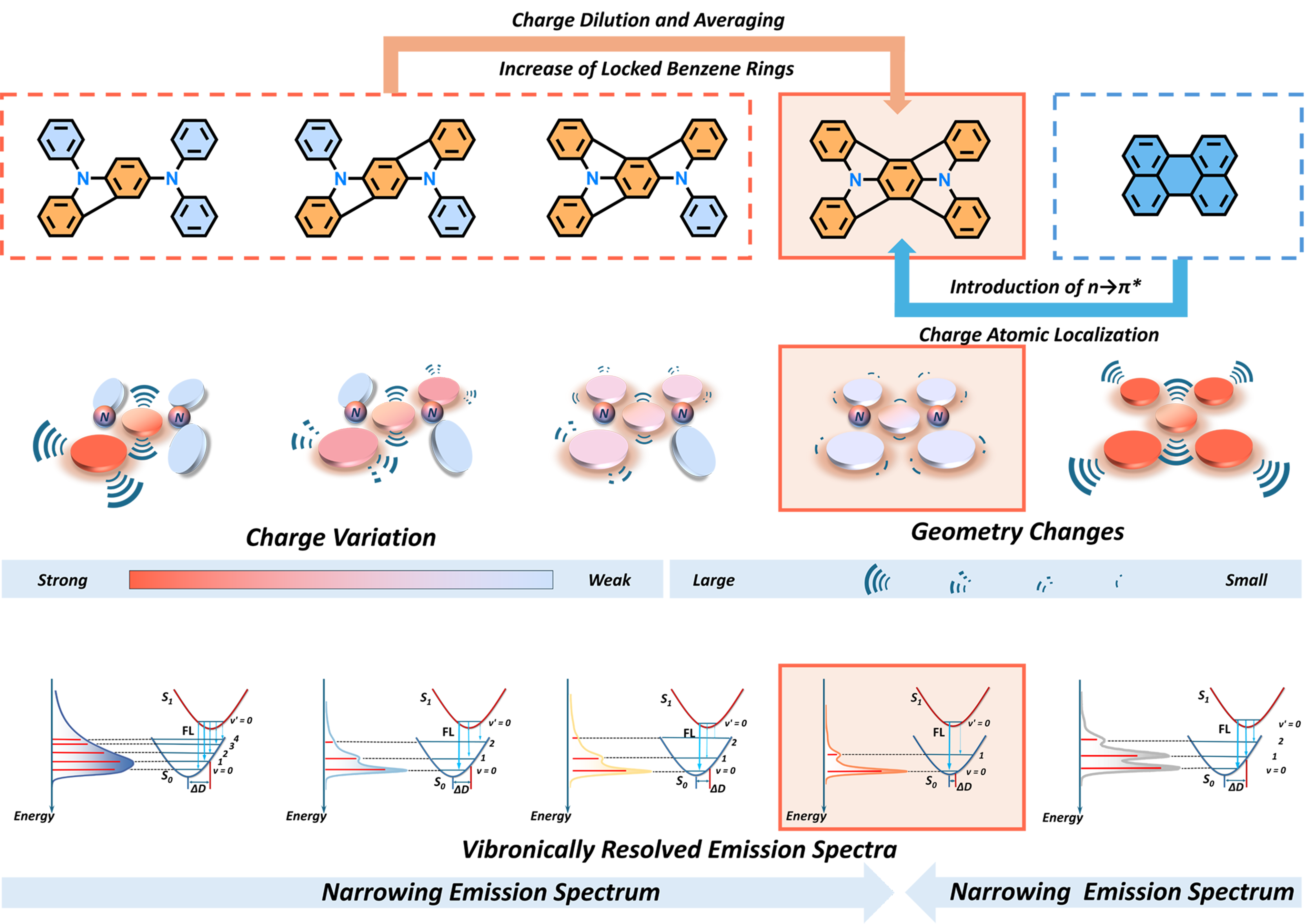 本质上,电子跃迁诱导电荷重新分布是导致电子-振动耦合的根源,即电子激发引起分子中电荷重新分布,电荷分布改变又必然造成分子几何结构的变化,且两者之间成正比例关系。一方面,氮杂原子的引入形成了n-π*跃迁,部分取代了纯碳稠环芳烃中单一的π-π*跃迁,导致部分电荷变化局域在氮杂原子上,减轻苯环上电荷变化;另一方面,随着锁定苯环数量的增加,苯环的电荷变化被逐渐稀释和平均化,从而抑制了外围苯环上C-C伸缩的高频振动耦合,对应于实验发射光谱0-1振动精细峰强度的逐渐减弱,最终导致发射光谱逐渐窄化。