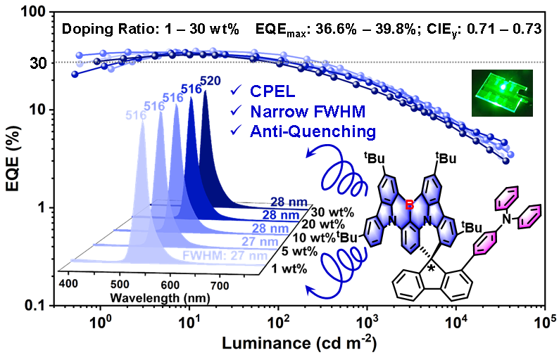 手性多重共振热活化延迟荧光材料具有高色纯度,高发光效率,并且可以直接生成左旋或右旋圆偏振光(CPL)的性能特点,在3D立体显示、加密信息存储以及光学通信等领域具有巨大的应用潜力。因此,开发圆偏振多重共振热激活延迟荧光(CP-MR-TADF)材料和相关器件具有重要科学意义。然而,该领域目前仍面临诸多挑战,如CP-MR-TADF材料的反系间窜越速率(kRISC)仍然较低,器件中存在很强的浓度依赖性,在高掺杂浓度下通常出现明显的光谱展宽和效率滚降,不利于OLEDs的实际应用。
