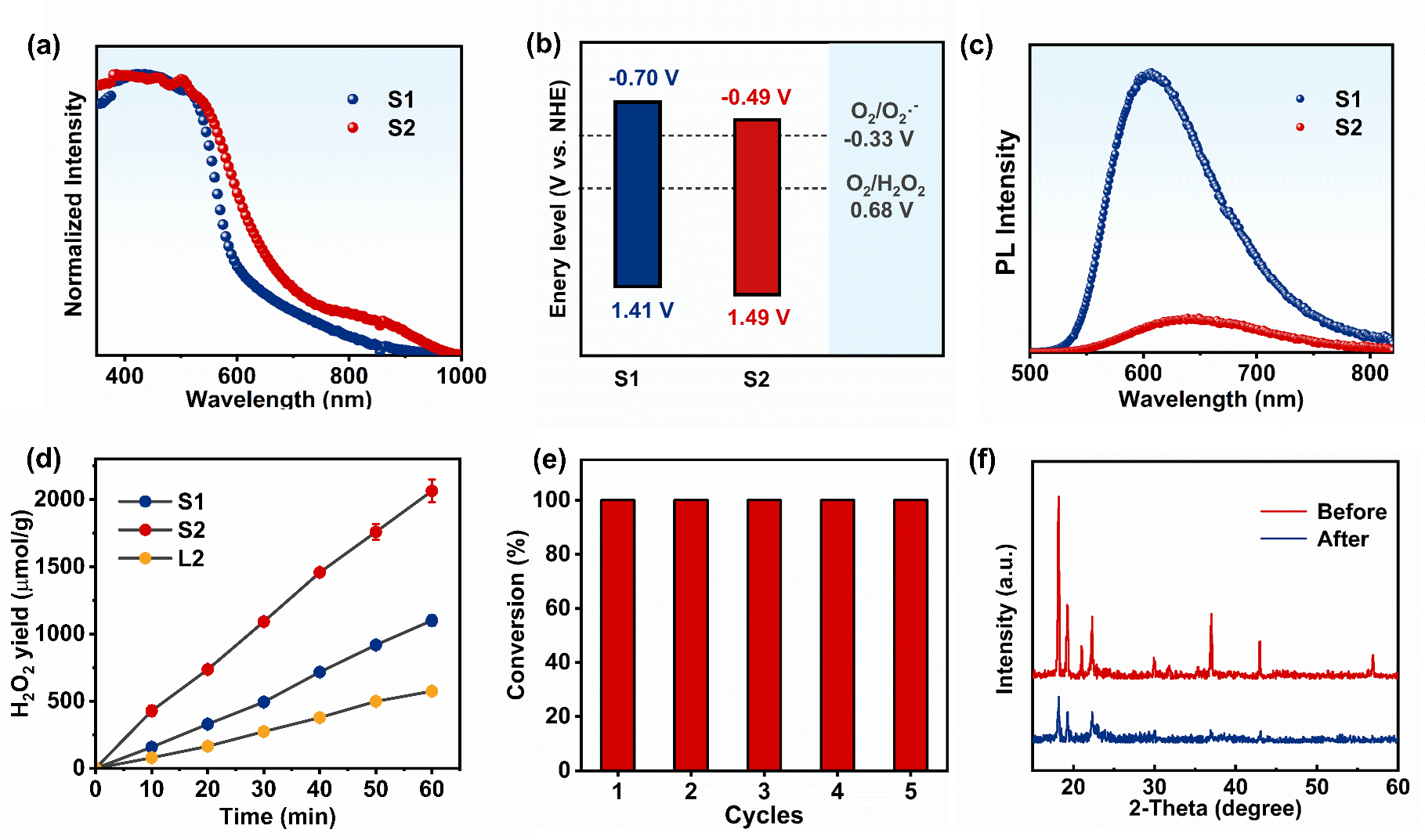 图1.S1和S2的(a)紫外-可见漫反射光谱;(b)能带结构示意图;(c)光致发光光谱;(d)S1和S2及配体L2在空气气氛、水中光催化生成H₂O₂的产率对比;(e)S2材料的五次循环稳定性测试及其在光催化反应前后的PXRD谱图对比(f)。
