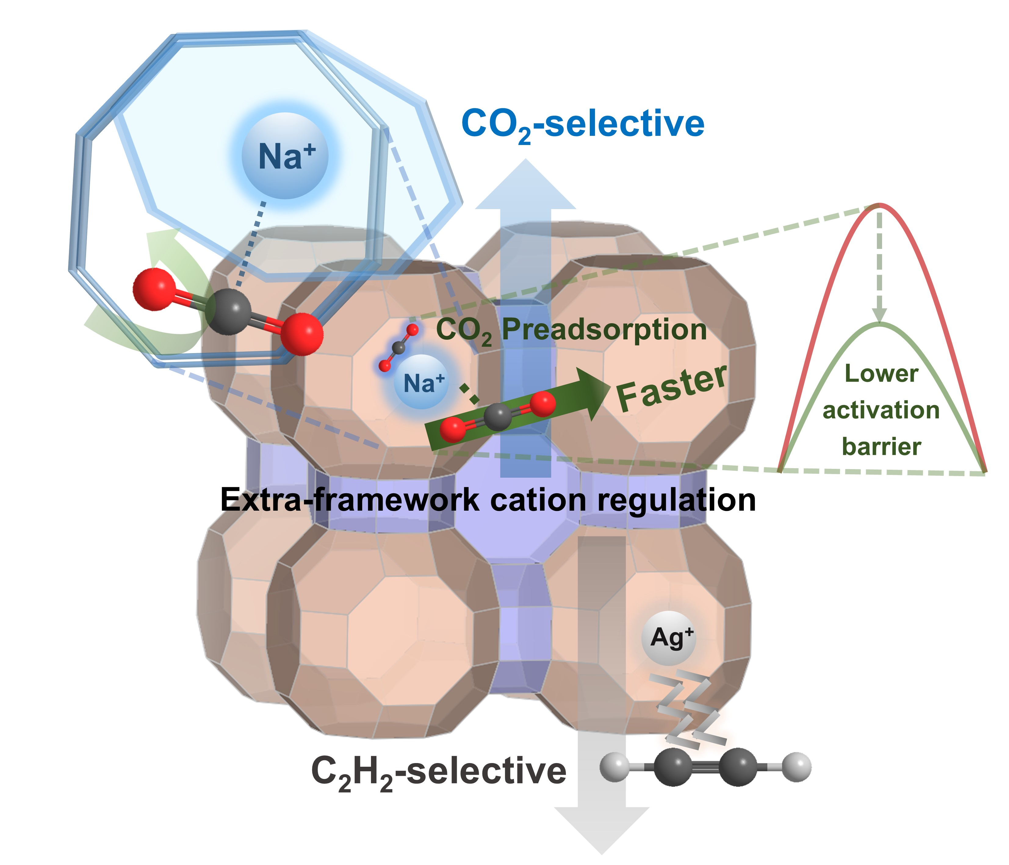 图1.RHO分子筛中阳离子调控反转乙炔/二氧化碳选择性与二氧化碳预吸附策略提高吸附动力学示意图