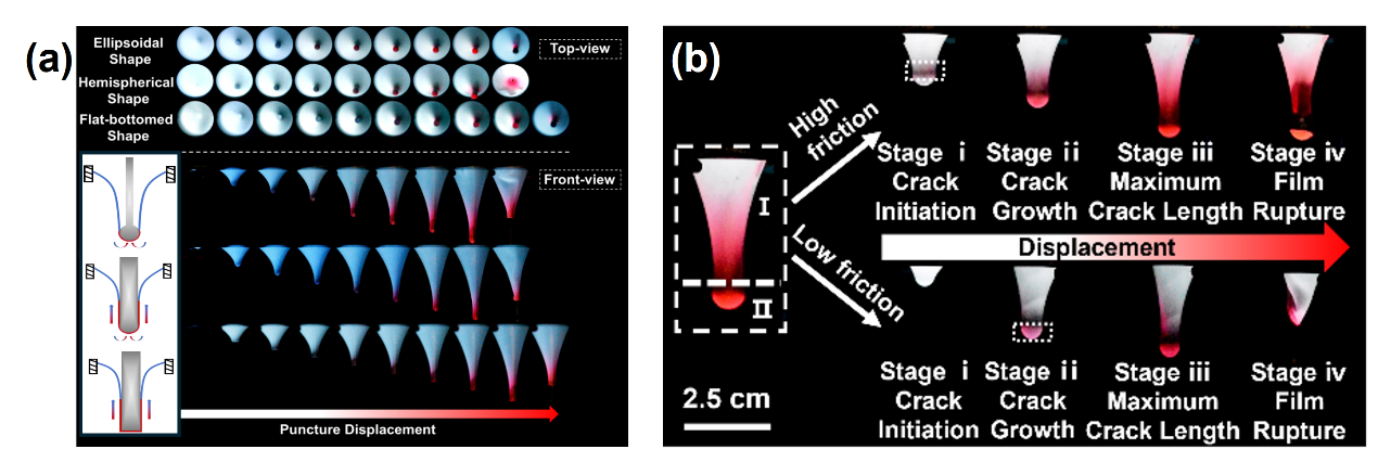 为此,陈于蓝教授团队开发了一类兼具优异力学性能与实时应力可视化能力的力致变色荧光离子凝胶。通过在体系中引入罗丹明力敏团作为应力探针,实现了穿刺过程中应力分布的直接可视化。系统研究了压头几何形状(椭球形、半球形、平底形)、直径、穿刺速率及界面摩擦等因素对穿刺行为的影响。结果表明,不同压头几何形状通过改变其接触模式主导穿刺行为:椭球形压头仅以尖端底部接触薄膜,产生显著的应力集中,因而诱导出最明显的荧光变色响应;平底形压头则因压杆侧壁与薄膜发生接触,部分穿刺力被耗散,力致变色敏感性最弱。同时,薄膜与压头间的界面摩擦力是调控裂纹扩展模式的关键因素——高摩擦力抑制界面相对滑移,致使裂纹从非接触区域萌生并扩展至整体断裂;低摩擦力则引发压头尖端滑移,使变形主要集中于接触区域,进而导致该部位优先发生穿刺变色。